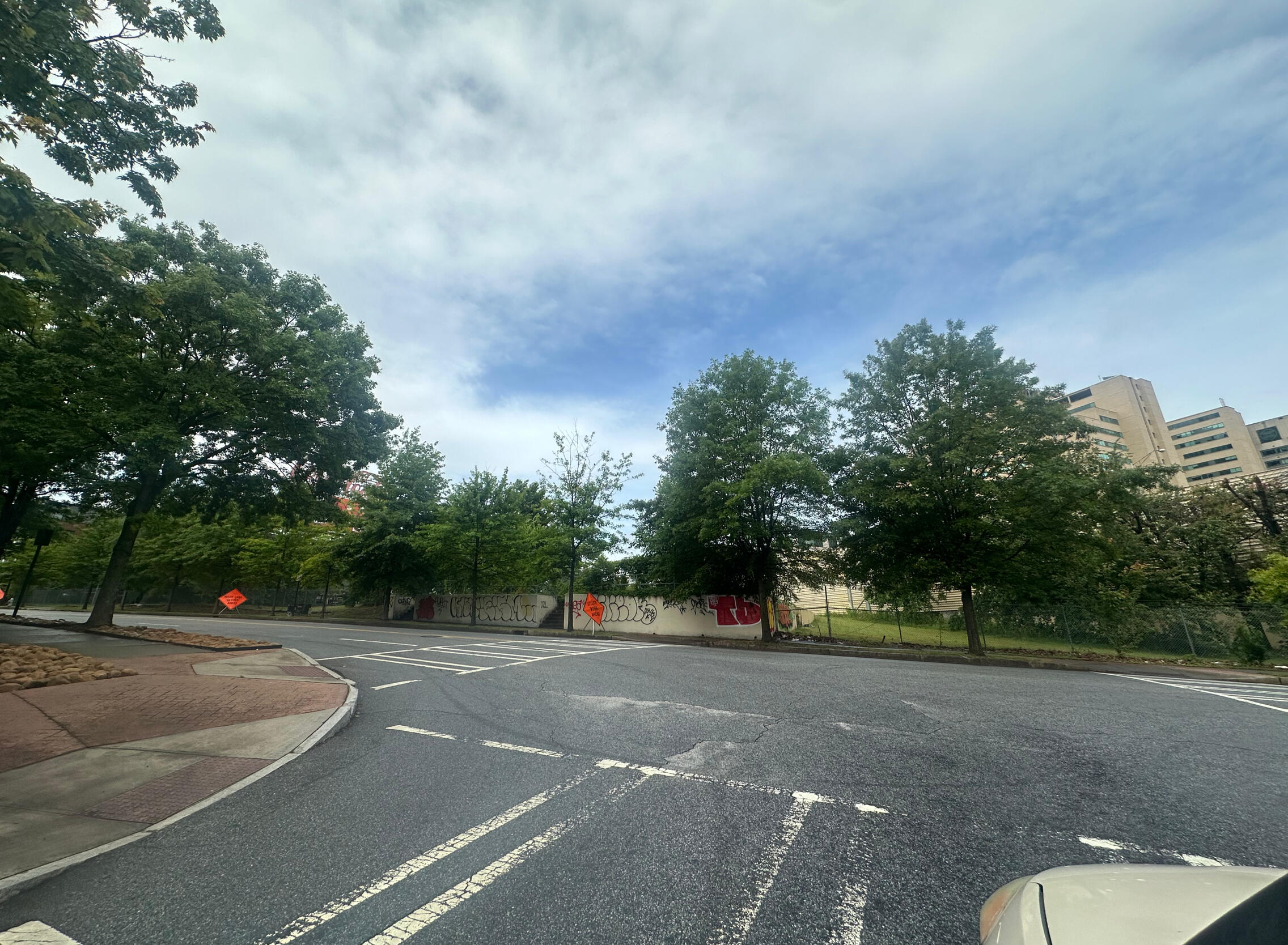 When the drone flew vertically from ground level as it appeared to be positioned directly in front of me, its ascent began directly in front of the orange sign next to the crosswalk. On May 7, the date of this picture and 126 days after the attack, this tree is the only tree on the street struggling to grow leaves. This is a theorized biological effect of spacetime warping on plants.