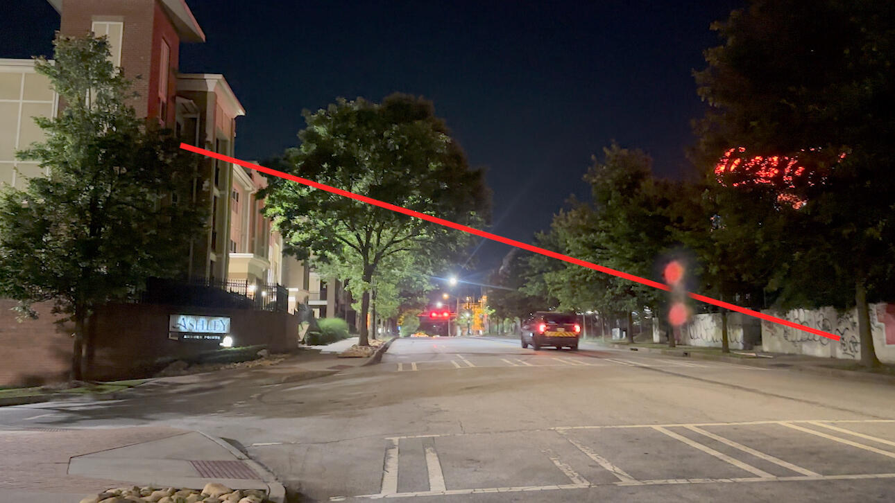 Here is a model of the approximate locations of the key moments throughout the drone's entire flight. Again, the drone consisted of two bright red lights, two extremely thin sheets of metal, and a completely transparent, warped middle section. I accurately remember its positioning and most of its movements, although I cannot recall the exact order of the drone's flight path with 100% accuracy. Throughout its entire flight before its ascent towards the hospital, the drone was in the middle of the street, either inside or close to the intersection. Before it ascended, I witnessed it in operation in the middle of the street about 40 to 60 feet in front of me, and it was only slightly above window level at its highest point. As I sat upright in my friend's bed daydreaming, I saw an unusually bright red light shining at the window. Before I opened the sunshades, I had a weird feeling that the light outside was something extremely abnormal. You could say I “felt” the drone before I saw it. Once I opened the sunshades in the apartment, I witnessed two extremely bright red lights near the intersection, slightly above window level, pointing directly at me with the top light angled towards me, while the drone moved laterally in my direction. My face immediately lit up like a kid in a candy store. I was overcome with nothing but awe, intrigue, and happiness as I observed the drone, since I thought that a baby alien accidentally teleported to the middle of Atlanta. I did not feel fear, shock, or worry for even a single second as I watched it gracefully dance through the air. The drone's beauty was indescribable; it felt like E.T. changed forms and found a new best friend. The device was always in motion, and its speed remained constant except for the vertical movement I described earlier. About a second after I first saw the drone, it quickly switched directions by tilting its top light and began moving away from me on its x-axis. After traveling away from me for 2-3 seconds, it repeated this same side-to-side movement. Once it was near the middle of the intersection, the drone angled its top and bottom lights perfectly vertical before descending and moving a few feet closer to the ground. Then, it moved towards me again, performing its same tilt and side-to-side movement a few more times. After this movement, my memory went completely blank, and the drone was now lined up directly in front of me, just a few inches in front of the tree on the opposite sidewalk. At this moment, the drone was ascending at a perfect 90-degree angle relative to the ground.